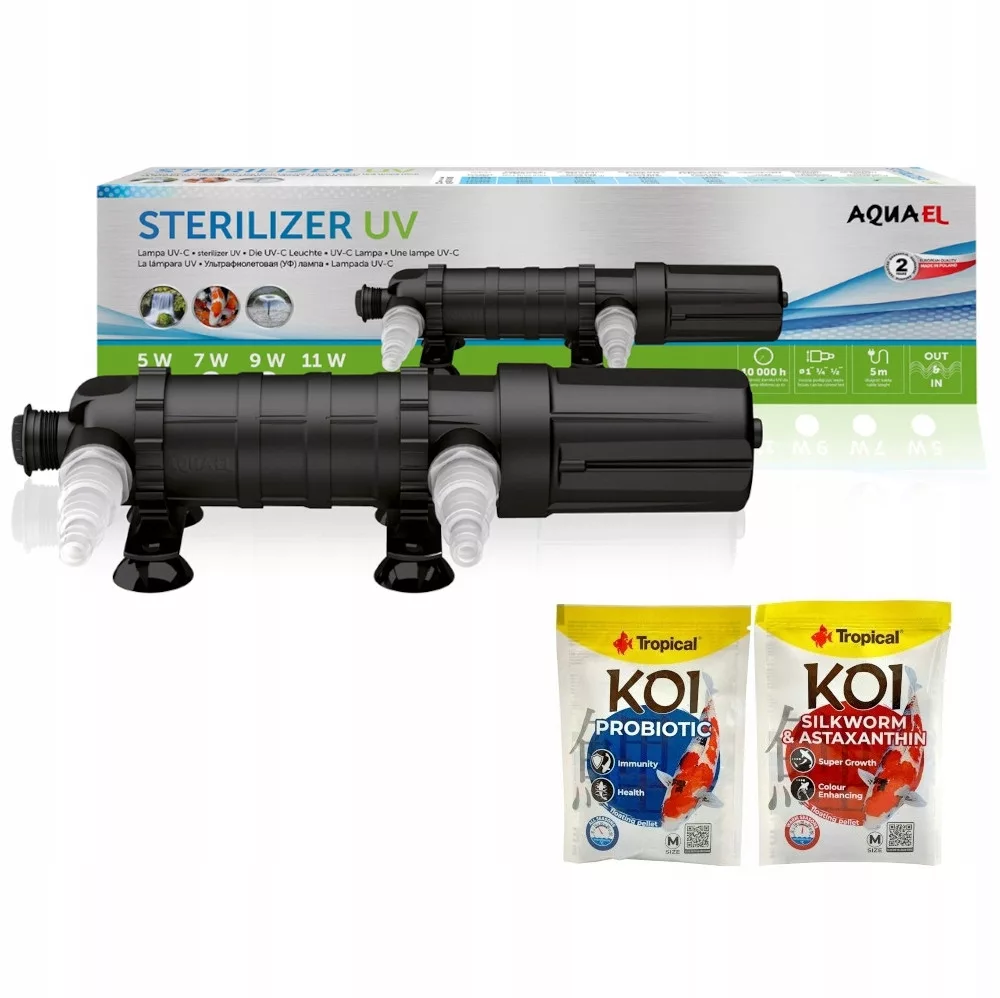 Aquael Sterylizer UV PS 2.0 jest to lampa UVC o mocy 7 W, przeznaczona do oczek wodnych i stawów o pojemności od 2 000 do 7 000 l. Skutecznie eliminuje organizmy jednokomórkowe, bakterie, wirusy i glony. Sprawdza się w zwalczeniu zielonej wody i zakwitów bakteryjnych wywołujących zmętnienie. Przystosowana jest do pracy wewnątrz oczka i poza wodą. Lampę należy podłączyć do pompy (brak w zestawie) o maksymalnym przepływie 3 500 l/h. Maksymalne zalecane ciśnienie 0,2 bar. Producent poleca model Aquael AquaJet PFN 3500.