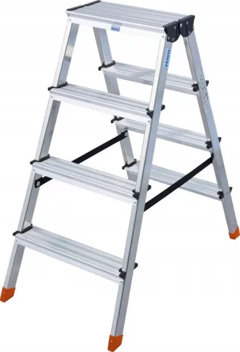 Lekka aluminiowa drabina z wejściem z dwóch stron dla wysokości roboczej do 3,30 m (wariant z 8 stopniami).