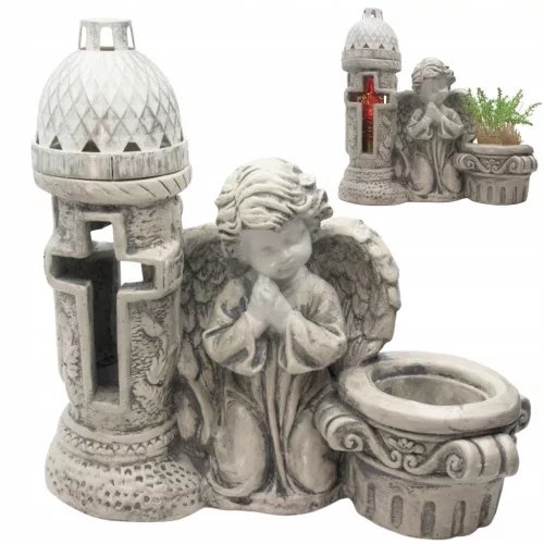 Wyjątkowa figurka przedstawiająca anioła w modlitewnej pozie, obok którego znajduje się latarnia oraz donica na kwiaty. To połączenie symboliki, elegancji i funkcjonalności sprawia, że dekoracja doskonale nadaje się do upiększenia miejsca pamięci. Wykonana z impregnowanego gipsu w kolorze antracytowym, zachwyca trwałością i dbałością o detale.