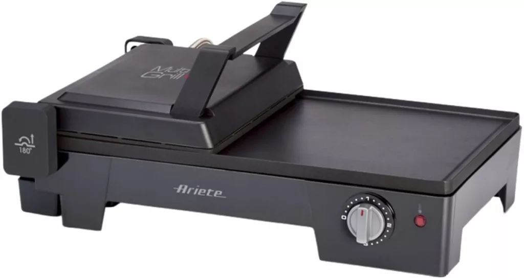 Dzięki precyzyjnej regulacji temperatury oraz podziale płyty grzejnej na karbowaną i płaską powierzchnię, można przygotować z pomocą grilla elektrycznego Ariete prawdziwą ucztę. Górna płyta grzejna rozkłada się do poziomu 180˚, tworząc w ten sposób bardzo pojemnego grilla o wymiarach 60x25 cm.