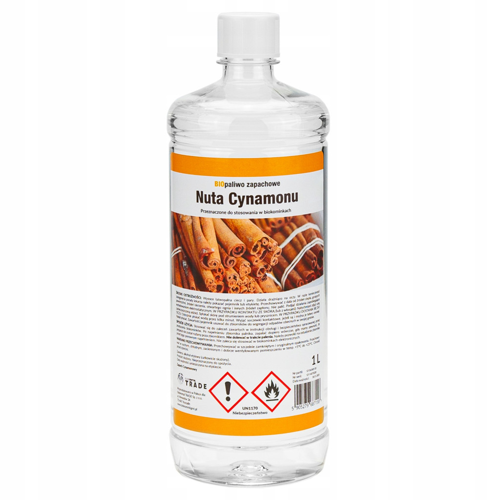 Ароматизираното биогориво 1 л с нотка канела е висококачествен продукт, подходящ за всички видове биокамини – окачени на стена, свободностоящи и вградени. Произведено в Полша с растителен биоетанол, то гори чисто, без дим, сажди или неприятна миризма, като същевременно отделя жълто-оранжев пламък и водна пара, безопасна за околната среда.