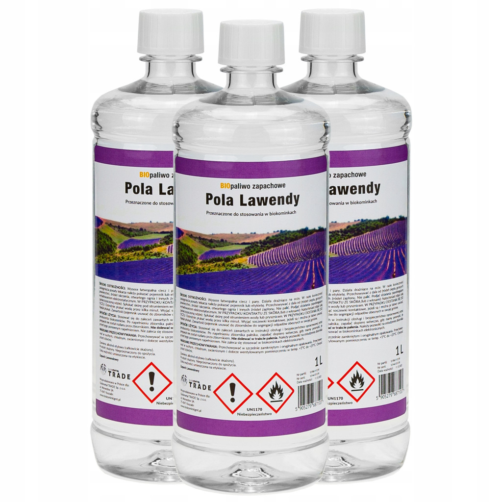 Предимства:Екологично и безопасно за здраветоПодходящо за всички видове биокаминиАромат на лавандулови полета за релакс и уютБез дим, сажди или пепелИкономично и ефективно – до 5 часа горене на литърПолски производител с доказано качество и сертификатЛесно дозиране чрез прикрепен дифузер