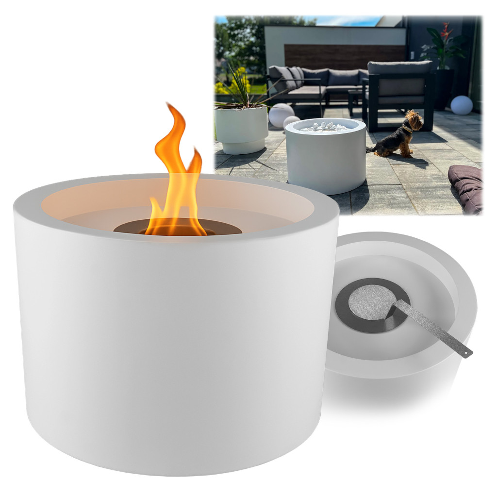 Биокамината Moon е елегантна и безопасна алтернатива на традиционната камина, изработена от висококачествена прахово боядисана неръждаема стомана. Тя използва екологично чисто, без мирис биогориво и осигурява топлина и уютна атмосфера във всяко помещение до 25 м². Горелката с обем 1 литър е снабдена с дръжка за безопасно гасене на пламъка, а монтажът е бърз и лесен. Структурният бял дизайн я прави перфектна за интериор и тераса, без необходимост от комин или специална вентилация.