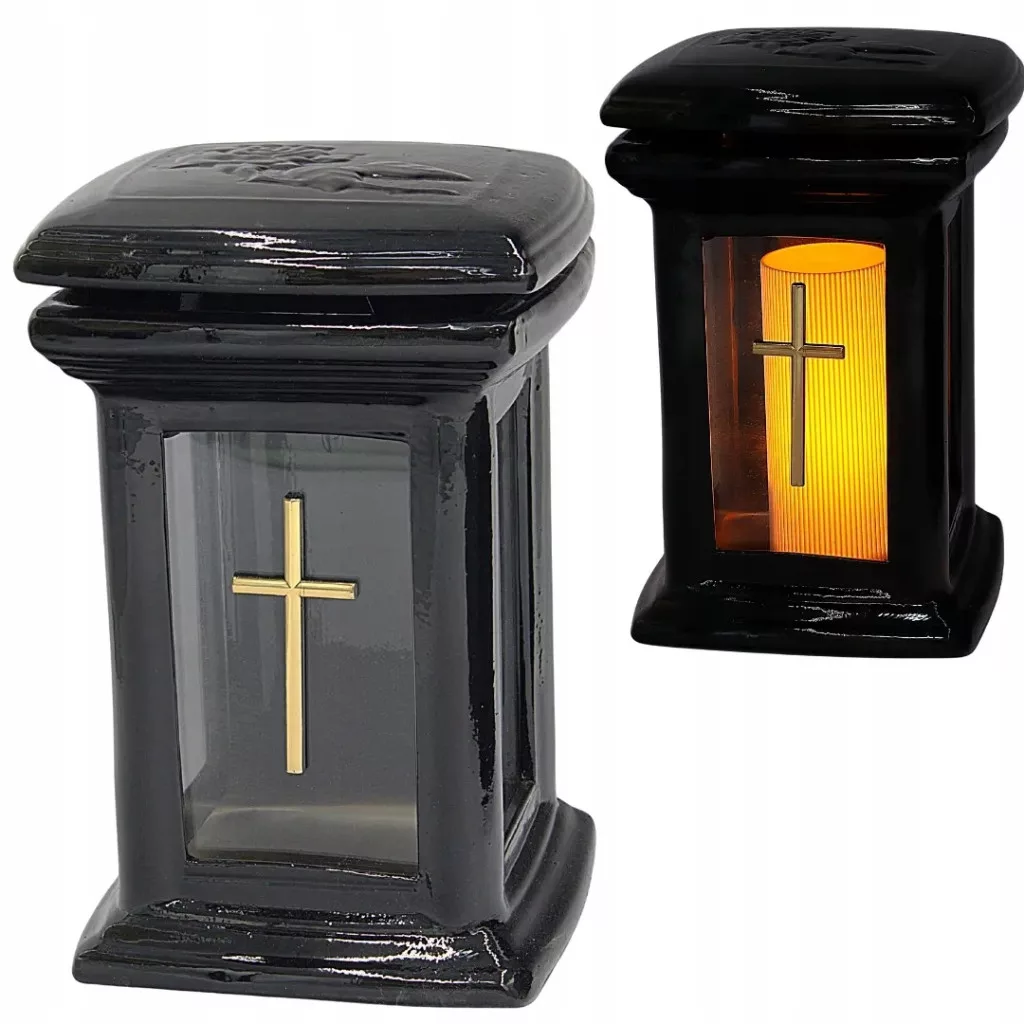 Znicz o kształcie kolumny wykonany z wysokiej jakości ceramiki. Głęboka czerń, szkliwiona powierzchnia i wkomponowany złoty krzyż czynią go wyjątkowym dodatkiem do miejsca pamięci. Solidne wykonanie gwarantuje trwałość i estetykę.