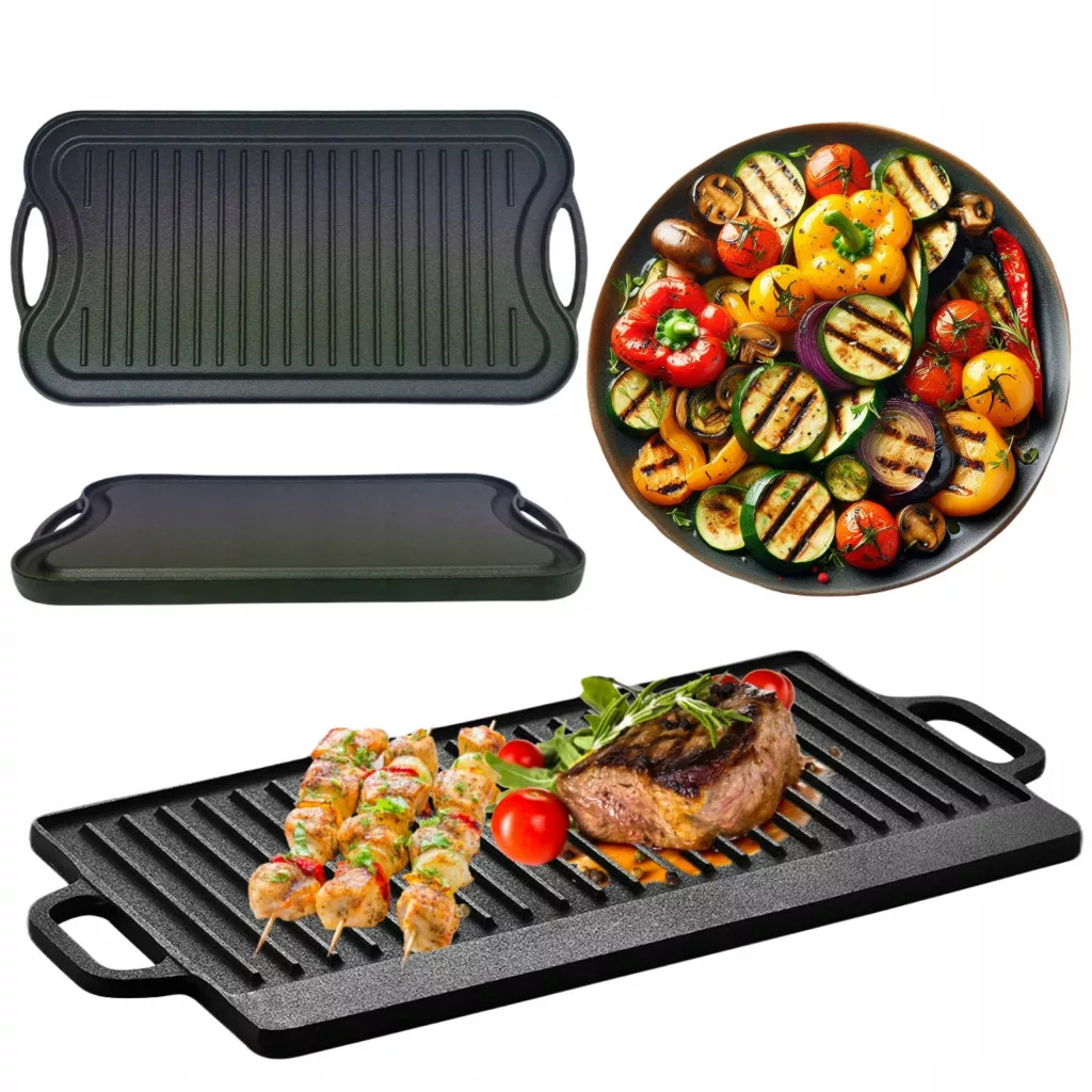 Jedna strona jest gładka, idealna do smażenia jajek, naleśników i delikatnych ryb, druga strona żeberkowana, doskonała do grillowania mięs.
