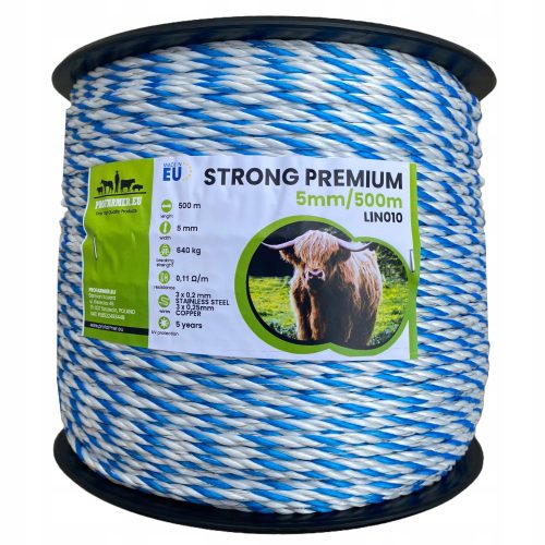 Plecionka STRONG PREMIUM to produkt najwyższej jakości. Druciki z miedzi zapewniają doskonałą przewodność. Grubość 5 mm zapewnia bardzo dużą wytrzymałość na zerwanie. Niebieski kolor gwarantuje najlepszą widoczność dla zwierząt (potwierdzone badaniami). Plecionkę można zastosować na każde zwierzę zarówno na krótkich, średnich i długich ogrodzeniach. Dzięki najlepszym parametrom plecionka ta sprawdzi się w ogrodzeniach elektrycznych stosowanych na najbardziej wymagające zwierzęta: bydło mięsne, dziki, konie.