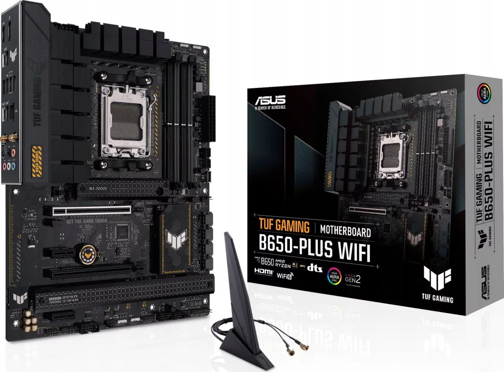 Płyta główna ASUS TUF Gaming B650-Plus WiFi wykorzystuje wszystkie kluczowe elementy najnowszej platformy AMD AM5. Zaprojektowana z komponentów klasy wojskowej, posiada ulepszoną sekcję zasilania oraz wszechstronny system chłodzenia. To solidna i stabilna podstawa, która oferuje wydajność przekraczającą oczekiwania nawet podczas najdłuższych maratonów gamingowych.