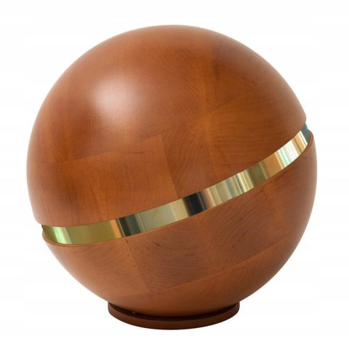 Solidna drewniana urna ze złotym ringiem wokół. Połączenie solidności naturalnego materiału i elegancji, które zapewniają godny pochówek dla dorosłej osoby.