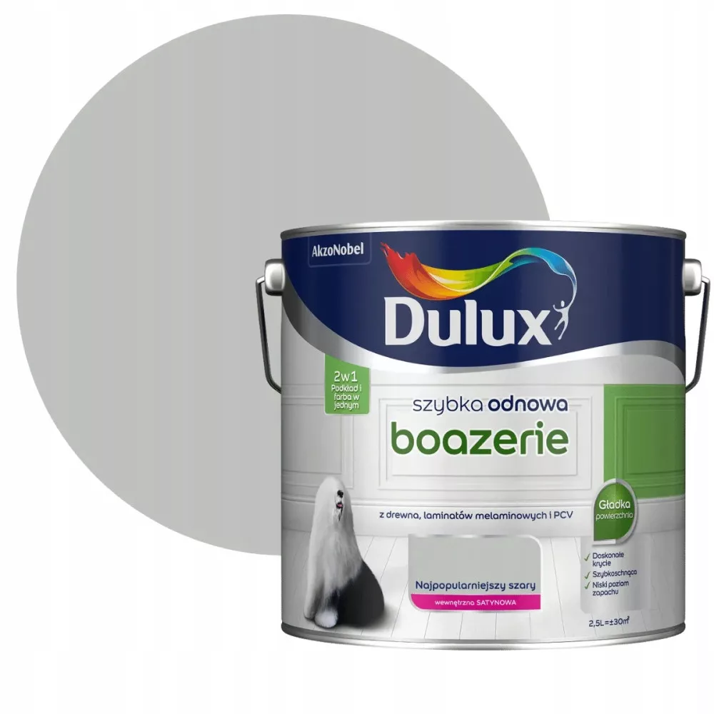 Dulux Szybka Odnowa BOAZERIE to wodorozcieńczalna farba do renowacyjnego malowania lakierowanych wcześniej boazerii, paneli ściennych zarówno drewnianych jak i pokrytych laminatami melaminowymi oraz PCV. Farba przeznaczona jest do stosowania wewnątrz pomieszczeń. Jest łatwa w użyciu, ponieważ nie potrzebujesz podkładu. Uzyskane powłoki charakteryzują się gładką powierzchnią i doskonałym efektem dekoracyjnym.