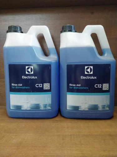 Płyn nabłyszczający do zmywarek Electrolux Professional 0S2094 C12 płucze naczynia i usuwa osady kamienia, zapewniając jasną powierzchnię.