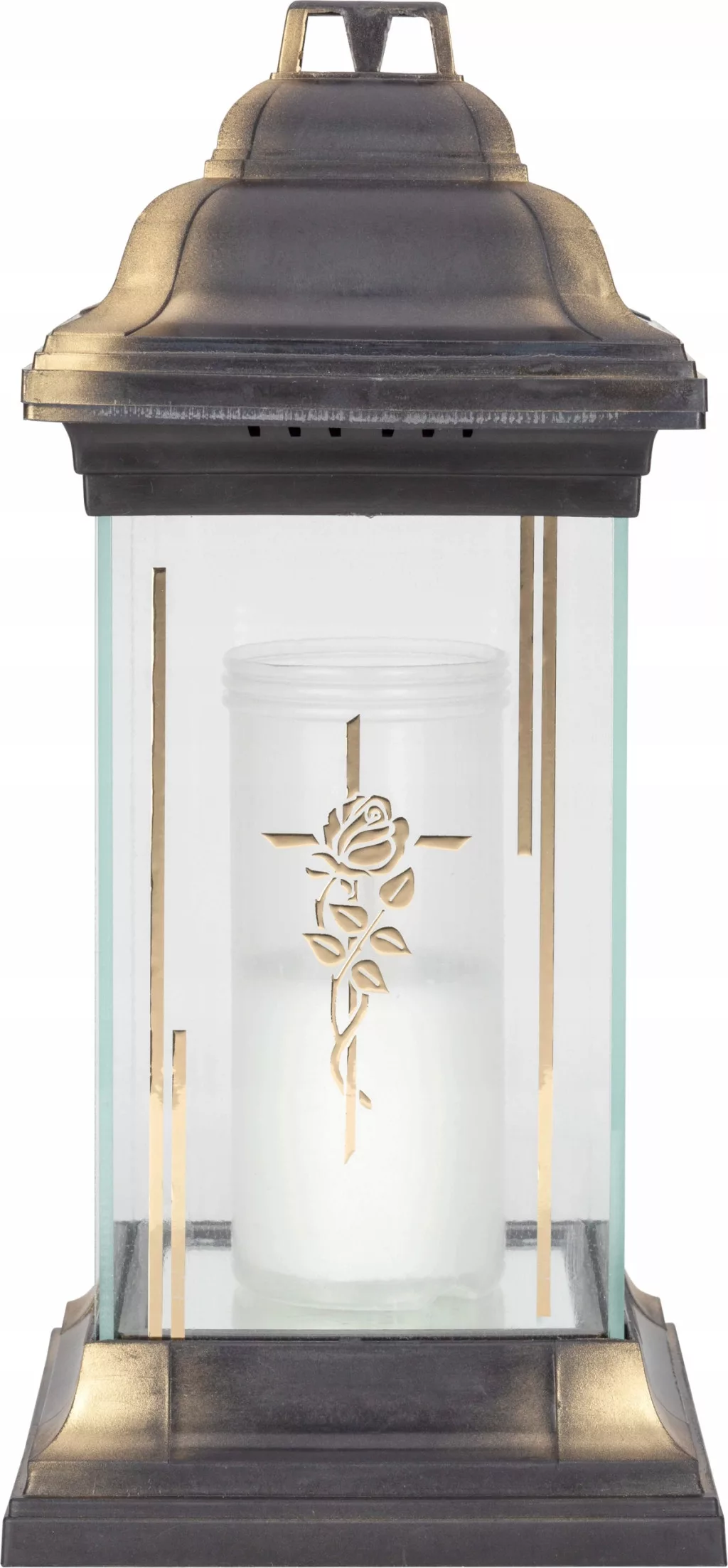 Znicz o wysokości 31 cm i średnicy 14 cm na grób o nowoczesnym designie i imponującej formie latarni doskonale podkreśla ważne chwile zadumy. Wykonany z przeźroczystego szkła, ozdobiony złotym krzyżem i dekoracyjną różą, znicz emanuje elegancją i urokiem. Elegancka kolorystyka czarno-złota podstawy i kapturka dodaje mu wyjątkowej estetyki. Znicz prezentuje się ponadczasowo dzięki prostocie i subtelności kolorystycznej, wprowadzając harmonię na grobową przestrzeń.