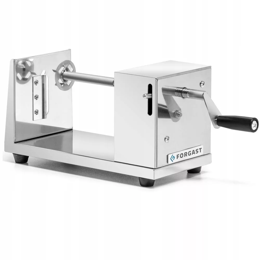 Maszynka do tworzenia zakręconych ziemniaków na patyku marki Forgast. Wytrzymała konstrukcja ze stali nierdzewnej. Maszynka posiada stalowe ostrze, 4 gumowe antypoślizgowe nóżki. Urządzenie działa na korbkę. Maszynka łatwa do utrzymania w czystości. Urządzenie posiada blokadę dźwigni.