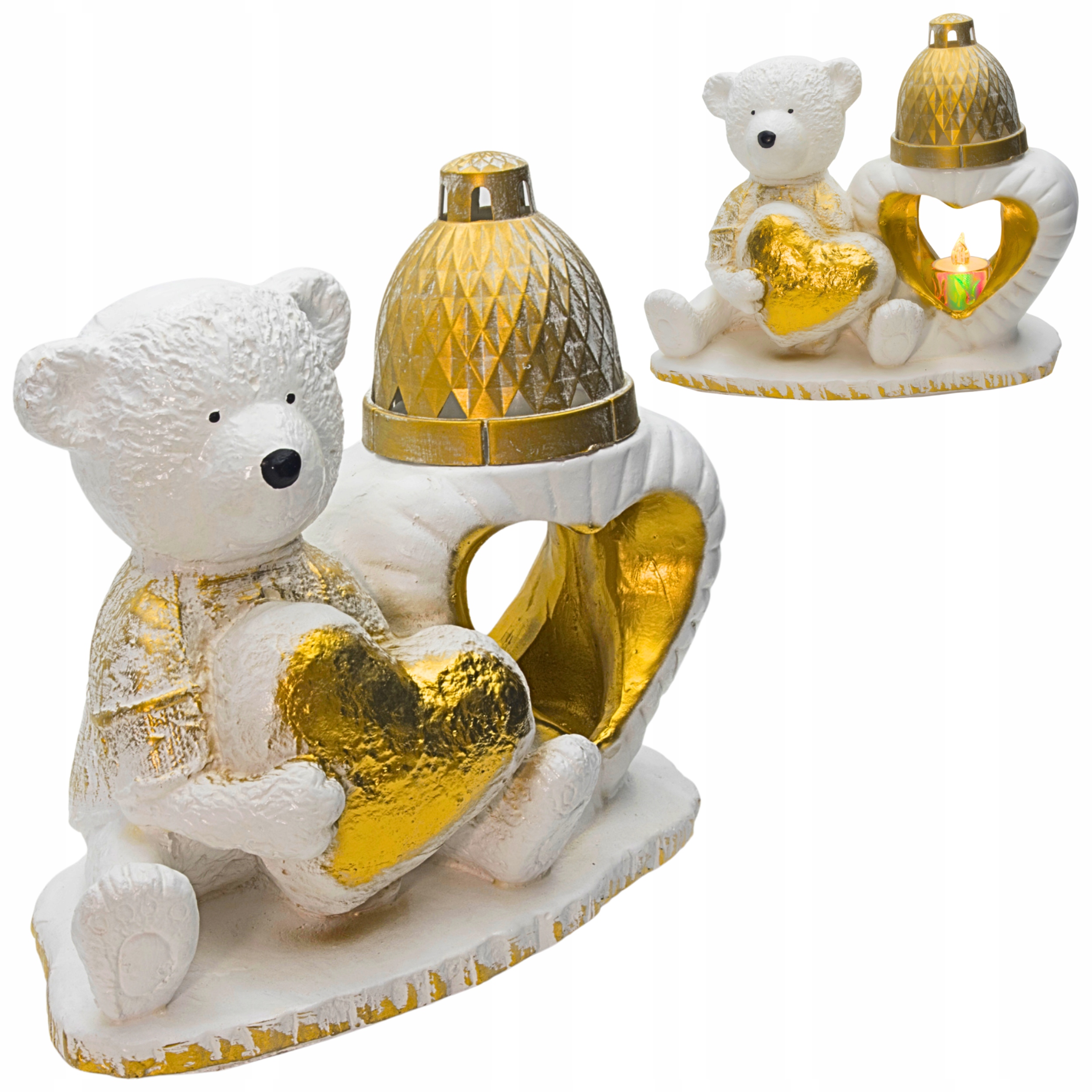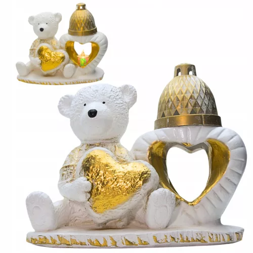 Znicz figurka nagrobna – miś z sercem i lampionem biało–złoty 27×22×12 cm 2,2 kg