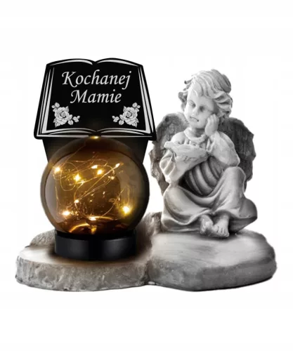 Piękna i wzruszająca dekoracja w postaci figurki aniołka siedzącego przy kuli z ciepłym światłem LED. Idealna zarówno na nagrobek jako symbol pamięci.