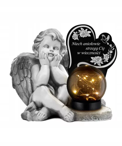 Piękna i wzruszająca dekoracja w postaci figurki aniołka siedzącego przy kuli z ciepłym światłem LED. Idealna zarówno na nagrobek jako symbol pamięci.