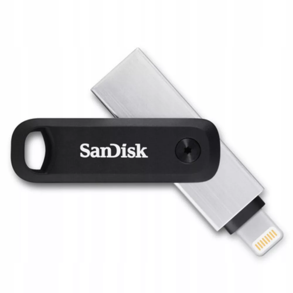 Pamięć flash SanDisk iXpand Flash Drive Go o pojemności 64 GB, która stanowi idealne rozwiązanie do łatwego zwalniania miejsca w iPhonie i przenoszenia plików pomiędzy urządzeniami.