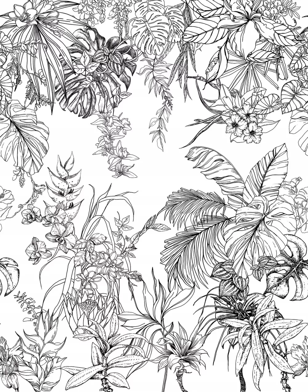 biało-czarna grafika przedstawiająca rośliny tropikalne