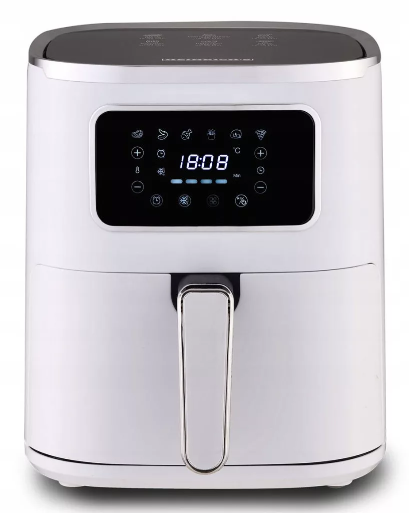 Obsługa frytkownicy jest niezwykle prosta dzięki intuicyjnemu panelowi z dotykowym sterowaniem i czytelnym wyświetlaczem LED. Użytkownik ma do dyspozycji 6 programów automatycznych oraz funkcje takie jak smażenie, pieczenie i rozmrażanie. Wbudowany timer można ustawić na maksymalnie 1 godzinę, a o statusie pracy informują liczne wskaźniki, w tym wskaźnik gotowości do użycia.