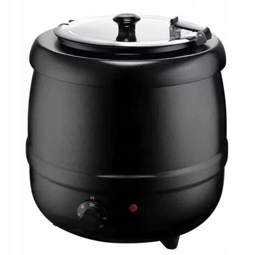 Profesjonalny kociołek do zup o poj. 10 litrów posiadający pokrywę i pojemnik na wodę wykonane ze stali nierdzewnej oraz stalową obudowę.