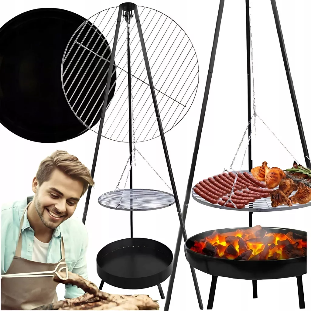 Podwieszony na trójnogu ruszt chromowany o średnicy 49 cm posiada możliwość regulacji wysokości w zakresie od 30 do 67 cm.