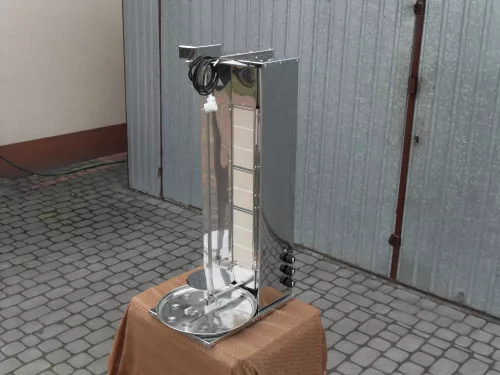 Sprzedam Kebab gazowy 3-palnikowy, ośmio płytkowy o wymiarach wys. 118 cm gł. 55 cm szer. 40 cm cena 1450 zł , nowy , z napędem elektrycznym, taca, pręt na mięso, z dolnym kijem przesuwanym, 1 rok gwarancji, atest sanepidu, palniki na płytkach niemieckich, możliwość dorobienia drzwiczek do kebabu ( zmniejsza zużycie gazu przez kebab) dopłata do drzwiczek 150 zł, możliwość przerobienia na gaz ziemny, możliwość zrobienia kebabu na zamówienie koszt przesyłki pokrywa kupujący.