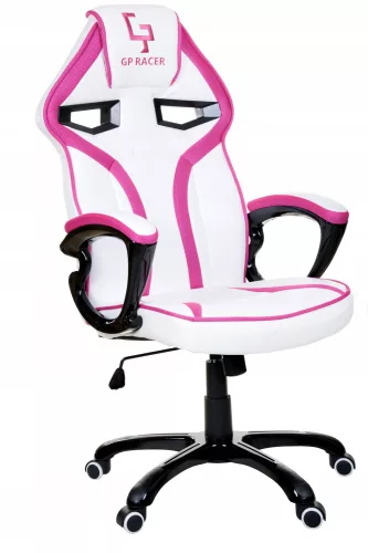 Obrotowy, nowoczesny fotel dla gracza Giosedio GP Racer wykonany ze skóry ekologicznej oraz z tkaniny membranowej. Fotel wyróżnia efektowna lakierowana podstawa i podłokietniki.