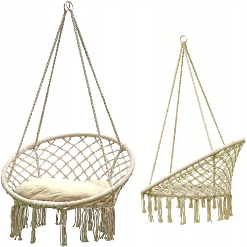 Solidna, stalowa obręcz gwarantuje bezpieczeństwo, a bawełniany sznur - wygodę. Miękka poduszka i ręcznie pleciona bawełna dbają o Twój komfort. Fotel wytrzymuje obciążenie do 120 kg. Wykorzystaj stelaż, gałąź, sufit etc. i powieś go w ogrodzie, na tarasie, balkonie lub w domu. Siedzisko z ciepłą i miękką poduszką podnosi komfort wypoczynku. Fotel wykorzystasz na świeżym POWIETRZU wiosną, latem i jesienią. Z tym hamakiem, relaks to czysta przyjemność!