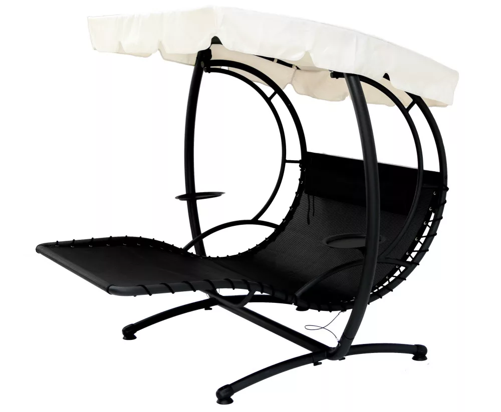 Nowoczesny stylowy design stawia nasze produkty na pierwszym miejscu wśród hamaków - leżanek pod względem komfortu oraz użyteczności produktów ogrodowych. Konstrukcja dwuosobowej leżanki wykonana jest z mocnych grubych stalowych rur co wpływa na bardzo dużą stabilność. Całość malowana proszkowo co gwarantuje odporność na warunki atmosferyczne przez wiele lat. Pokrycie leżanka wykonane jest z polietylenowego tworzywa które jest bardzo trwałe oraz przyjemne w dotyku. Aby zwiększyć komfort wypoczynku nasz produkt wyposażony jest w daszek chroniący użytkownika przed promieniami słonecznymi jak również przed niespodziewanym deszczem