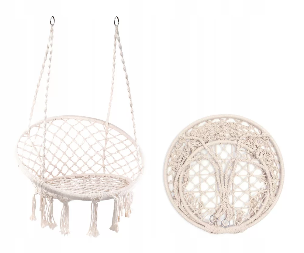 Huśtawka wykonana jest z solidnego sznurka (podwójny splot) i metalowej obręczy co gwarantuje bezpieczeństwo i komfort zabawy. Ma niepowtarzalny wygląd pajęczej sieci, dzięki czemu rewelacyjnie się prezentuje. Jest idealnym pomysłem na zabawę dla dzieci, a jej nowoczesny design sprawia, że idealnie komponuje się w każdej aranżacji wnętrza ogrodowego, salonu, tarasu czy pokoju.