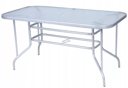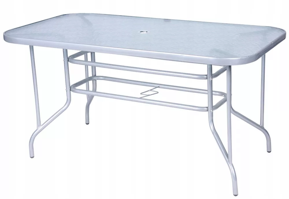 Stół ogrodowy z solidną metalową ramą i szklanym blatem w nowoczesnym stylu, odpowiedni do ogrodu, tarasy, kawiarnie, altany, balkony czy plaże.