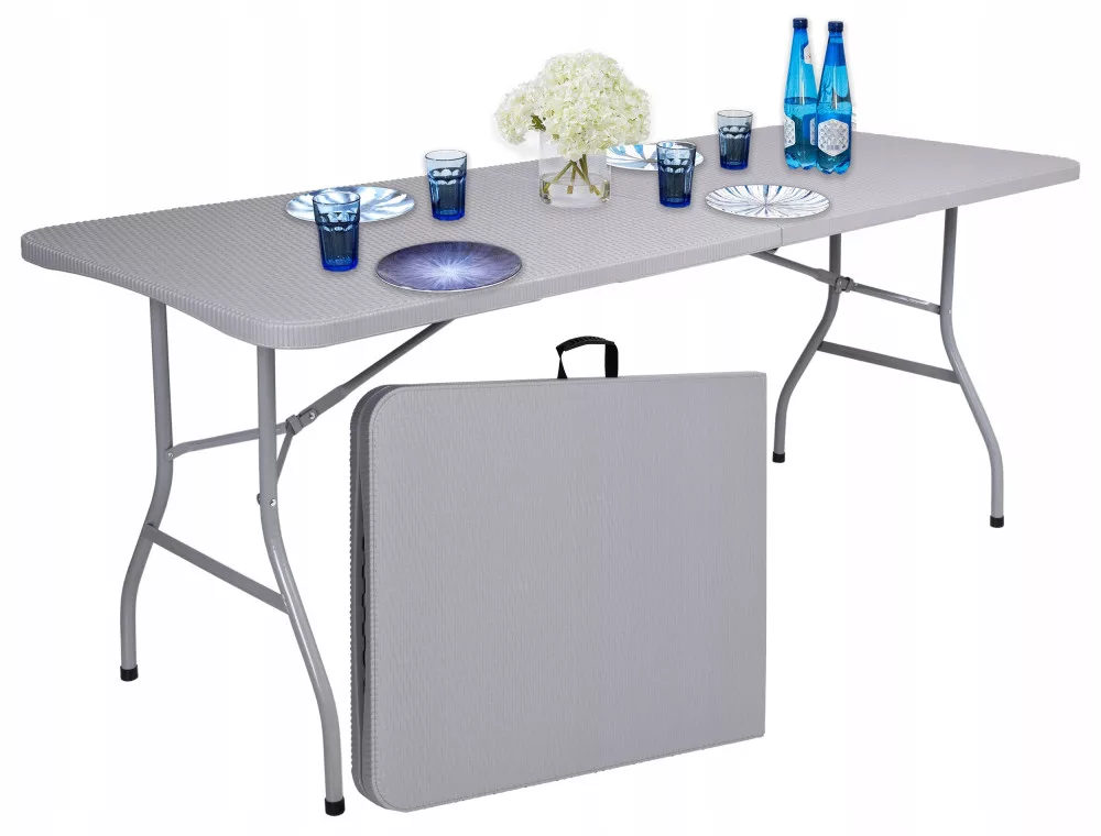 Składany stół cateringowy. Bardzo praktyczny i lekki. Konstrukcja wykonana ze stali malowanej proszkowo. Blat wykonany z polietylenu HDPE. Wzorowany na rattan. Odporny na promienie słoneczne. Dzięki unikalnemu projektowi całość konstrukcji chowa się w blat stołu, zajmując mało miejsca i tworząc ergonomiczną walizkę, łatwą do przenoszenia.