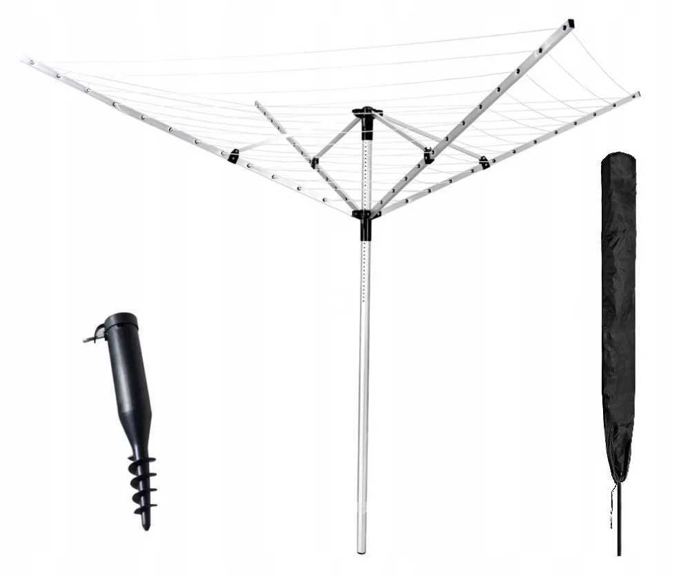 Wystarczy wkręcić znajdującą się w zestawie kotwę w ziemię i zamocować suszarkę. W razie potrzeby suszarkę można wyjąć z kotwy i schować w bezpiecznym miejscu.
