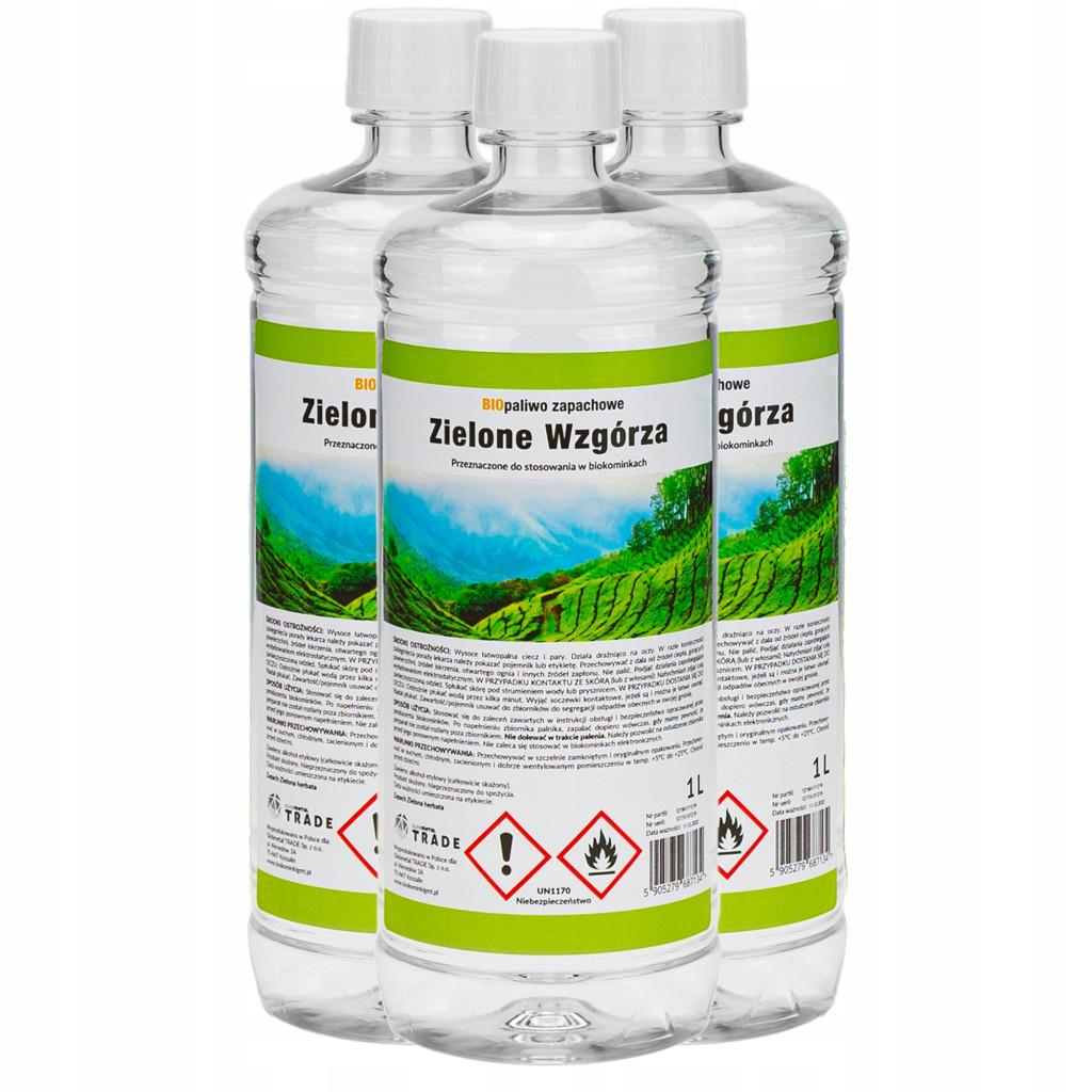 Основни характеристики:Полски производител с доказано качествоСвеж аромат на зелени хълмове за уют и топлинаЕкологично и 100% безопасно за здраветоБез дим, сажди или пепелИкономично и ефективно – бързо повишаване на температуратаВисока калоричност – до 5 часа горене на литърБутилка с дифузер за лесно дозиране