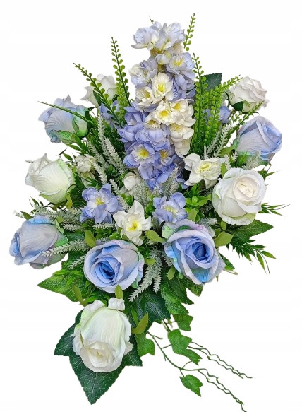 Гробен Аранжимент с Изкуствени Цветя - Сини и Бели Рози в Циментиран Кош
