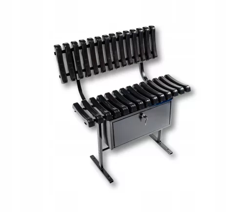 Ławka na cmentarz PCV 14 żeberek z oparciem oraz skrzynką na Twoje narzędzia i akcesoria do pielęgnacji nagrobka. Siedzisko i oparcie wykonane z żeberek PCV w kolorze czarnym. Stabilna metalowa konstrukcja malowana proszkowo zapewni Ci bezpieczeństwo i wygodę użytkowania. Skrzynkę umieszczoną pod siedziskiem łatwo otworzysz na zewnątrz. Wszystkie skrzynki tego wariantu wyposażamy w zamek z zestawem kluczyków.