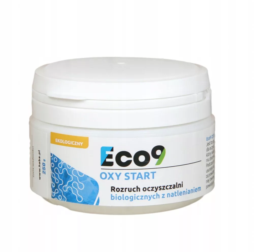 Opakowanie 250 gramów Eco9 OXY START rozpuścić w 5 litrach letniej wody (max 32°C), pozostawić roztwór na 30-60 minut. Całość wlać do komory napowietrzania ścieków. Opakowanie wystarcza na zaszczepienie oczyszczalni obsługującej do 1,5m3 ścieków na dobę. W przypadku większych oczyszczalni zwiększyć dawkę. Po użyciu umyć ręce.