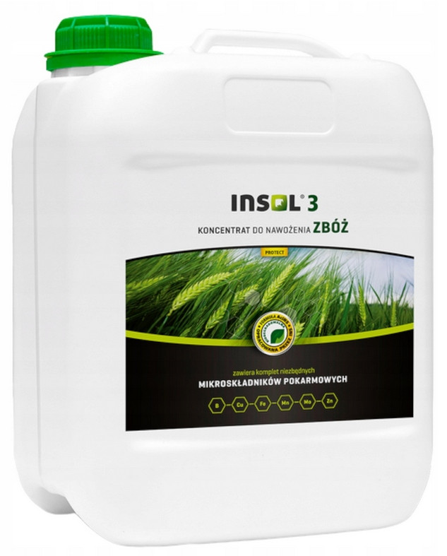 INSOL 3 jest koncentratem azotowo-magnezowo-mikroelementowym dostosowanym składem chemicznym do fizjologicznych potrzeb roślin zbożowych. Azot i magnez są wprowadzone do nawozu w formach zapewniających najszybsze pobieranie przez liście, natomiast mikroelementy są skompleksowane naturalnym organicznym kompleksonem. Nawóz jest całkowicie rozpuszczalny w wodzie, nie tworzy osadów i nie zatyka końcówek opryskiwaczy.