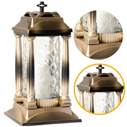 Znicz ozdobny na grób o subtelnym i delikatnym kształcie z podstawką i kapturkiem w kolorze złotym. Dzięki eleganckiemu wzorowi, starannemu wykonaniu znicz będzie pięknym symbolem pamięci. Wykonany został ze szkła odpornego na wysokie temperatury i materiału odpornego na warunki atmosferyczne.