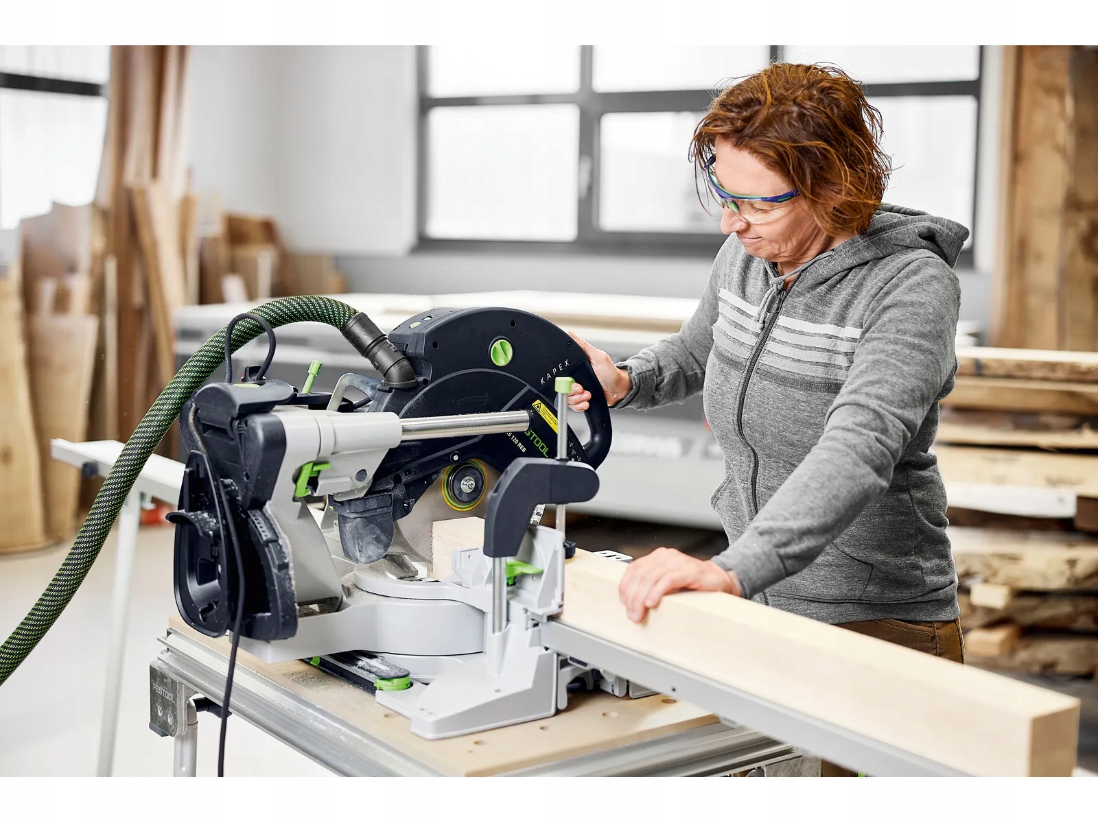 Prowadnica do obcinania długich elementów do cięcia z prawej i lewej strony Kapex KS 120 i KS 88 z modułem transportowym wspomagają pracę i ułatwiają przycinanie listew i belek na długość. Prowadnicę do obcinania długich elementów można łatwo zamontować: włożyć w rowek w kształcie litery V, zablokować, rozłożyć podpórkę i wyregulować. Ograniczniki można szybko i łatwo zdemontować na czas transportu.