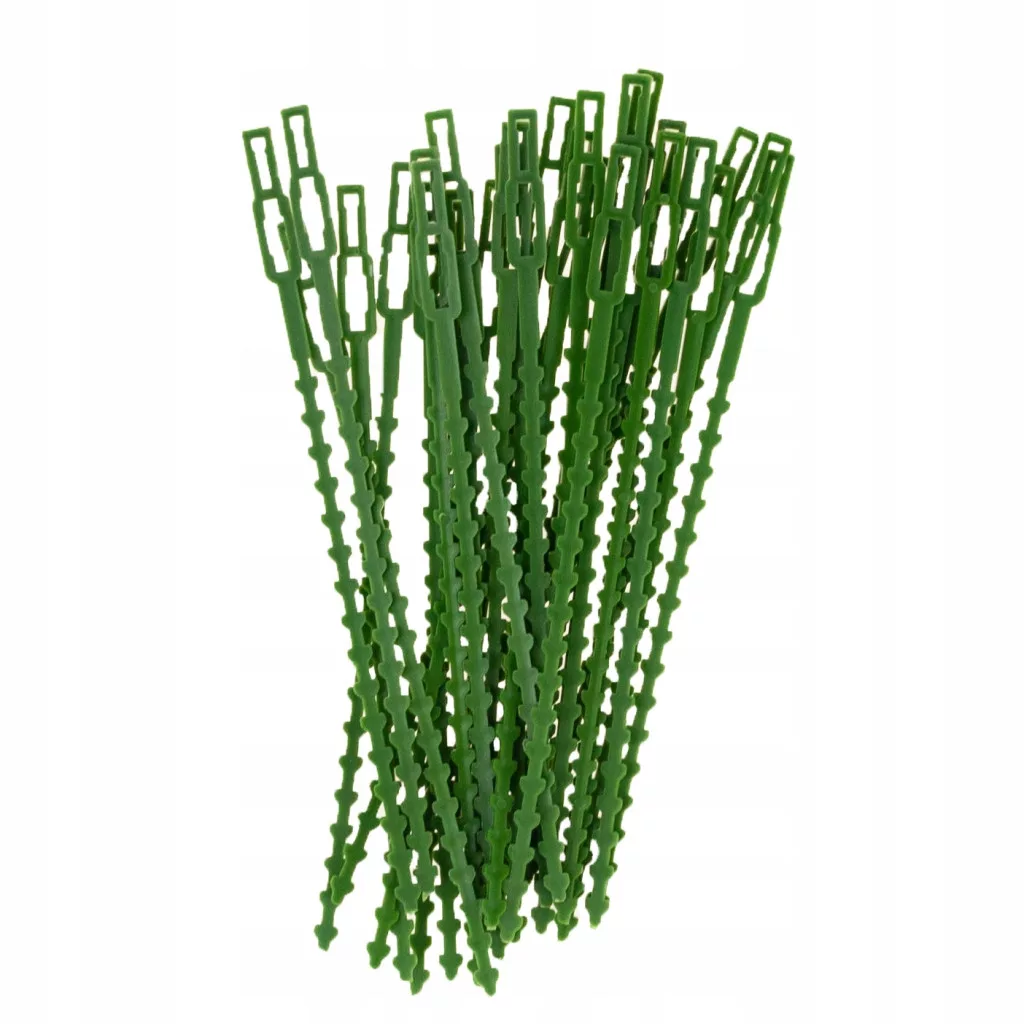 Idealne do podwiązywania roślin i krzewów. Wykonane z elastycznego tworzywa, które nie kaleczy pędów roślin. Regulowane, łatwo się je otwiera i zamyka. Do wielokrotnego wykorzystania. Odporne na warunki atmosferyczne i promieniowanie UV. Zielony kolor sprawia, że opaski użyte przy roślinie są niemalże niewidoczne.
