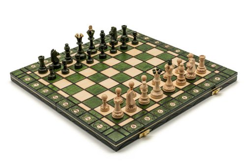 Komplet stanowi kaseta z planszą szachową, zestaw figur szachowych w kolorach białym i zielonym po 16 elementów w każdym.