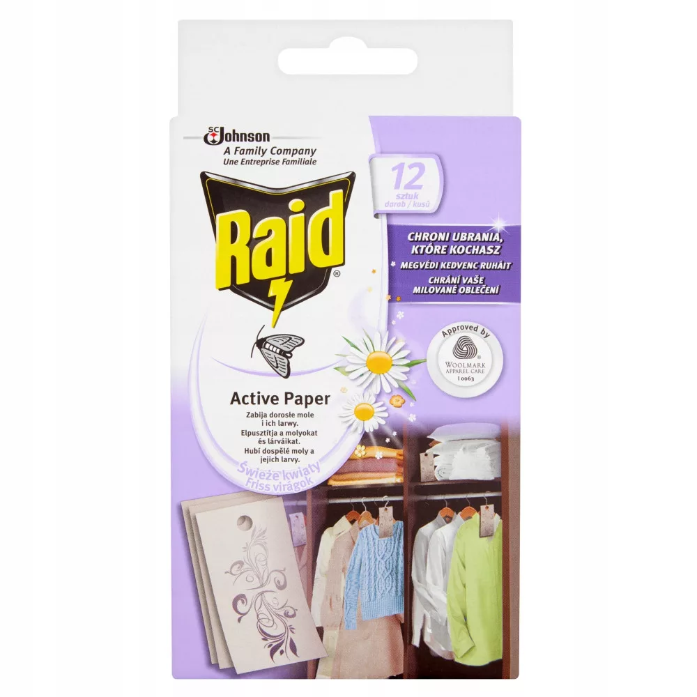 Raid - aktywne zawieszki na mole zawiera feronom, który wabi i pozwala na skuteczne pozbycie się uporczywych moli ,zarówno dorosłych osobników jak i larw. Jednocześnie zapewnia delikatny, kwiatowy zapach