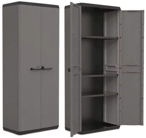 Wysoka szafa PIU wykonana została z najwyższej jakości tworzywa sztucznego wykazującego się dużą odpornością na uszkodzenia mechaniczne. Dzięki temu znakomicie odnajdzie się w każdym pomieszczeniu gospodarczym - pralni, spiżarni, garażu, a także przydomowym warsztacie. Szafa PIU wyposażona została aż w 3 ładowne półki - maksymalny udźwig na każdą z nich wynosi aż 15 kg. Ponadto dolna stała półka jest w stanie pomieścić aż do 30 kg różnych przedmiotów. Jednym z wielu atutów praktycznej szafy są ergonomiczne uchwyty, które dodatkowo posiadają specjalne otwory umożliwiające zamykanie drzwiczek na kłódkę. Wysoka szafa PIU zaskakuje swoim minimalistycznym i eleganckim wyglądem oraz uniwersalnym zestawieniem kolorystycznym, dzięki czemu doskonale wkomponuje się w wystrój każdego pomieszczenia.