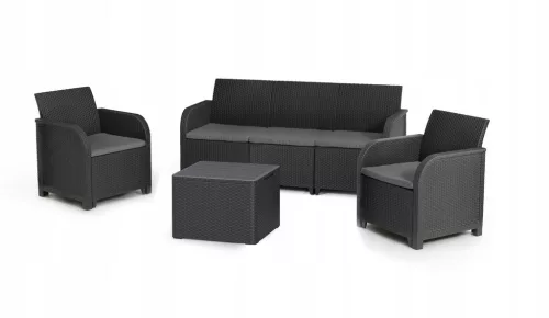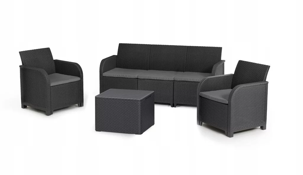 Komfortowy 5 osobowy komplet mebli Rosali z zaokrąglonymi podłokietnikami i stołem z dodatkową funkcją przechowywania to idealne zastosowanie do ogrodów, balkonów, tarasów. Nawet w ograniczonej przestrzeni z zestawem rattanowym Rosali można stworzyć wymarzone miejsce wypoczynku na świeżym powietrzu. Dzięki unikalnej konstrukcji przed dokonaniem montażu, możesz wybrać jedną z dwóch dostępnych konfiguracji. Wszystkie potrzebne części znajdują się w kartonie z 3 osobową sofą, dwoma fotelami i stołem.