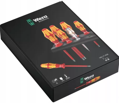 Trzpienie izolowane gwarantujące bezpieczeństwo pracy do 1000 V Strefy twarde zapewniające szybkie pokręcanie, strefy miękkie umożliwiające przenoszenie wysokiego momentu obrotowego Z systemem wyszukiwania narzędzi Take it easy: oznaczenie kolorystyczne rozmiaru Sześciokątny kołnierz zabezpiecza przed uciążliwym staczaniem się narzędzia z miejsca pracy Końcówka Lasertip zapewnia pewne osadzenie narzędzia we wkręcie 7-częściowy zestaw wkrętaków Kraftform testowanych pojedynczo wg IEC 60900. Indywidualnie kontrolowana izolacja pod napięciem 10000 V gwarantuje bezpieczeństwo pracy pod napięciem 1000 V. Rękojeść Kraftform zapewnia przyjemną i ergonomiczną pracę chroniąc dłoń przed powstawaniem pęcherzy i odcisków. Twarde strefy chwytu umożliwiają szybkie pokręcanie, miękkie strefy zapewniają przenoszenie wysokich momentów obrotowych. Część wkrętaków z końcówką Lasertip: wierzchołek "wgryza się" w gniazdo wkrętu i zapobiega wyślizgiwaniu się narzędzia. Z systemem wyszukiwania narzędzi "Take it easy": oznaczenie kolorystyczne rozmiaru. Kołnierz zapobiegający staczaniu się narzędzia z miejsca pracy. Z jednobiegunowym testerem fazy i wieszakiem ułatwiającym przechowywanie.