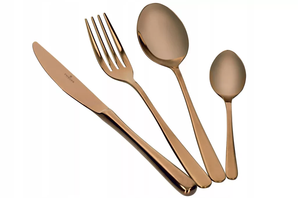 Miedziany kolor i połyskujące wykończenie dodają całemu kompletowi VESPER COPPERY charakteru vintage oraz sprawiają, że doskonale wkomponuje się on zarówno w nowoczesne, jak i tradycyjne jadalnie, prezentując się na stole niezwykle pięknie i efektownie.