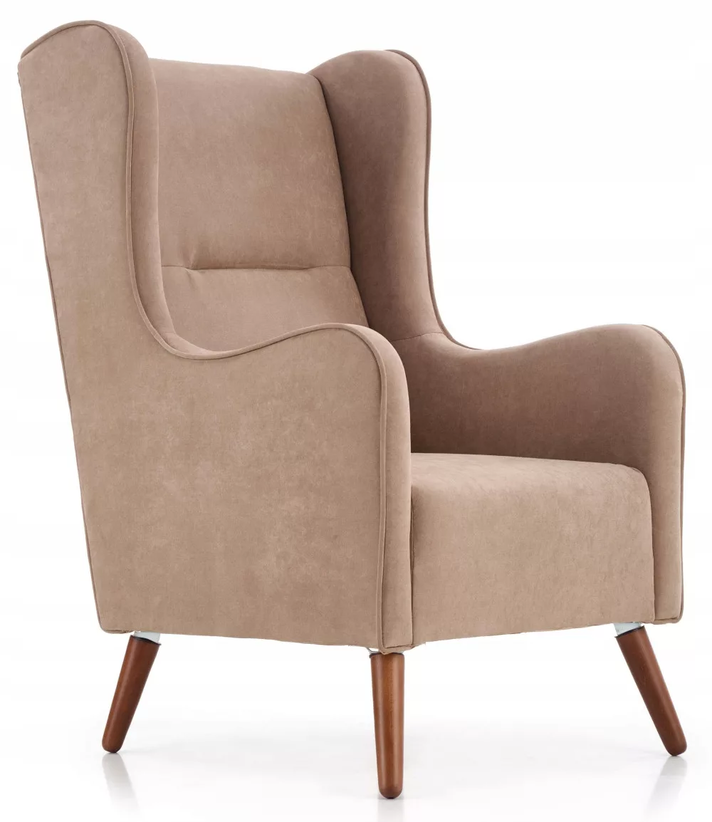 Elegancki fotel do salonu w klimacie vintage. Tapicerowany w całości tkaniną, z nogami z drewna litego. Charakteryzuje się niebanalnym wyglądem i wysokim komfortem użytkowania.