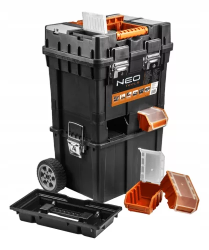 Warsztat mobilny NEO (nr ref. 84-115) o wymiarach 40 x 40 x 70.5 cm. Pojemny i mobilny warsztat narzędziowy wykonana został z wytrzymałego tworzywa sztucznego z metalowymi zapięciami. Wyposażony został w koła do łatwiejszego przemieszczania się. Warsztat składa się z 3 funkcjonalnych elementów. Jest kompletnie rozbieralny. Górna część składa się ze skrzynki narzędziowej, środkowy moduł składa się z czterech ergoboxów a dolny z pojemnej skrzyni na większe narzędzia. Warsztat posiada także 4 organizery do przechowywania drobnych elementów, tackę wewnątrz i wygodne dwa uchwyty do przenoszenia lub ciągnięcia. Dodatkowo blat skrzynki wyposażony został w pomocny wpust pozycjonujący z miarką. Marka NEO spełnia oczekiwania profesjonalistów.
