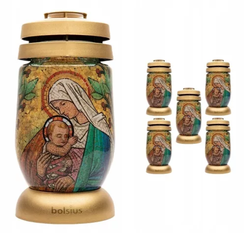 ✅ Ozdobny witrażowy lampion z wizerunkiem Matki Boskiej z Dzieciątkiem.