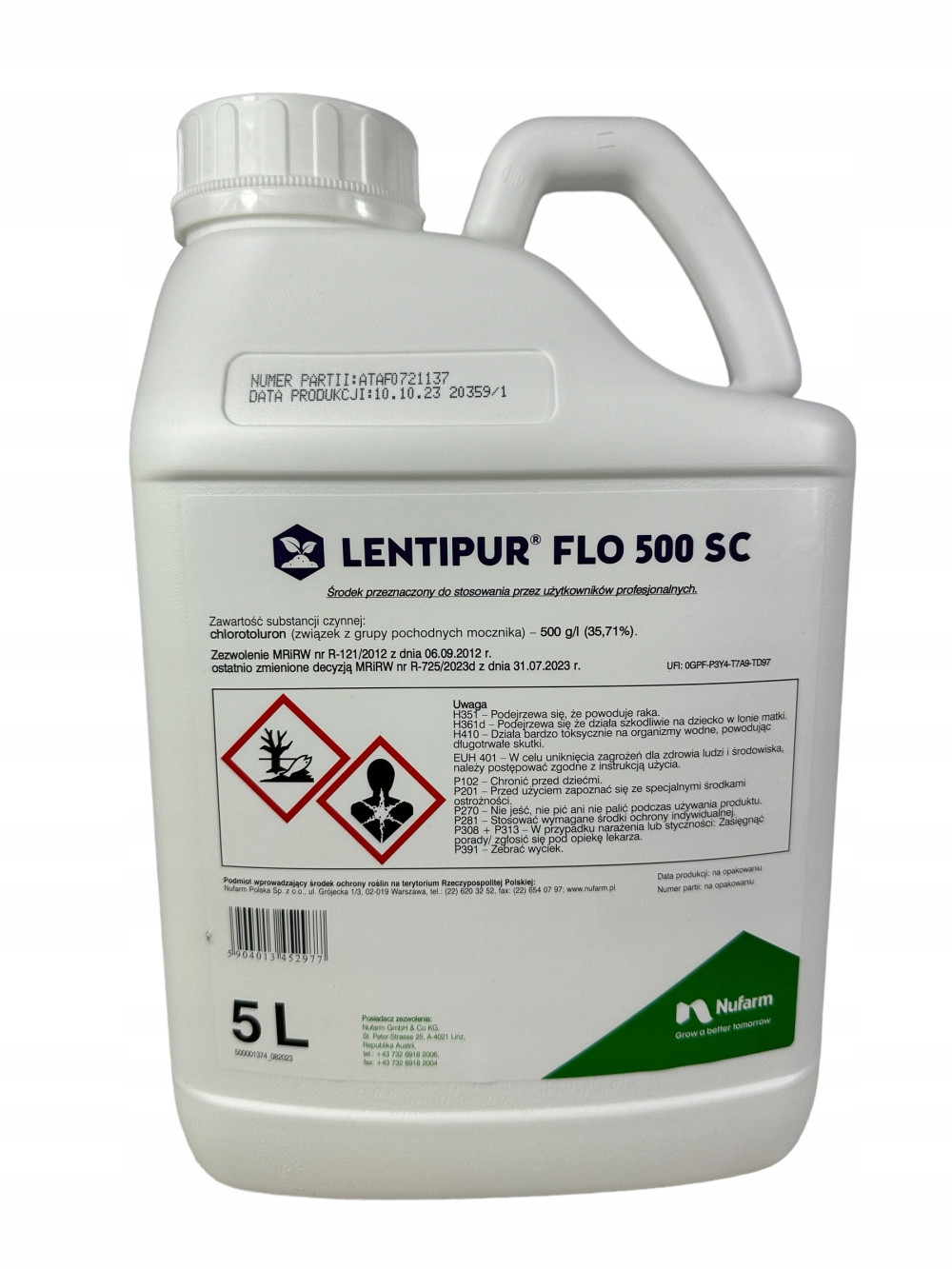 LENTIPUR FLO 500 SC 5L jest środkiem chwastobójczym w formie koncentratu stężonej zawiesiny do rozcieńczania wodą, stosowany doglebowo lub nalistnie, przeznaczony do zwalczania miotły zbożowej oraz jednorocznych chwastów dwuliściennych w pszenicy ozimej, pszenżycie ozimym, życie, jęczmieniu ozimym. Pobierany jest przez korzenie i liście chwastów.